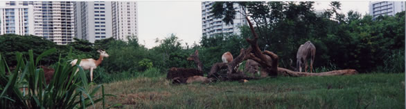 | 〜ホノルル動物園〜 こんな街中に動物園があるのであまり期待せず に行ったのですが、とても広く珍しい動物も沢 山いて楽しめました。特に可愛かったのはミー アキャットでした。下の写真も動物園の中から 取った物ですがちょっと不思議で良いでしょ。 右の標識は動物園に入った所に立っていて世界 各国の動物園までの距離が書いてあります。 ホノルル動物園HPへモ |